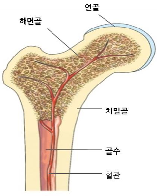 골수 (조혈공간) - 해면골 사이에 존재. 혈액세포(혈구-적혈구 백혈구 혈소판) 생성