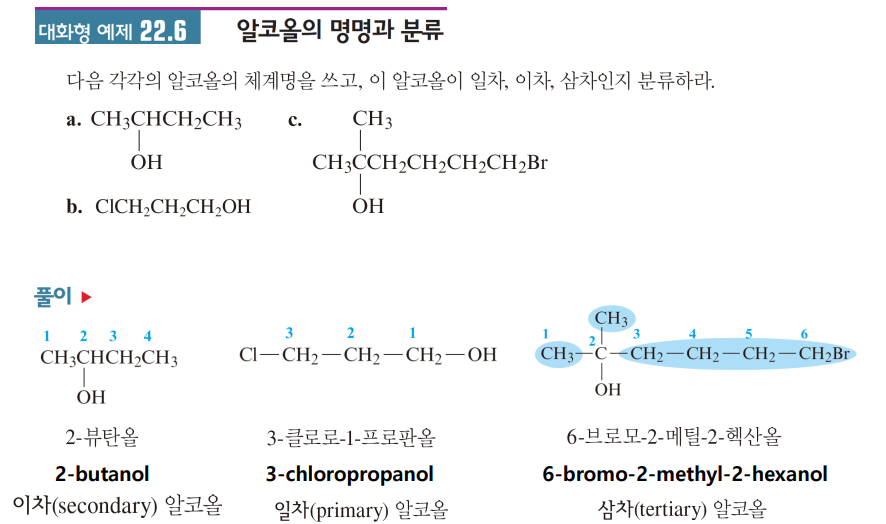 | 1. 알케인 -e → -ol 2. -OH가 작은 수가 되도록 번호 매김 (propanol 이후부터) ex. 메탄올, 에탄올, 1-프로판올 |