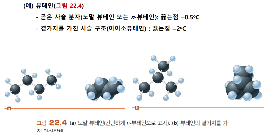 가지칠수록 → 접촉 표면적 작음 → 분산력 작음 → 끓는점 낮음
