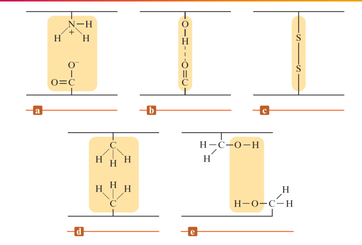 | 펩타이드 결합 | 사슬원자(C=O, N-H) 간 수소 결합 | 이온 결합 수소 결합 이황화물 결합! (공유결합) 런던 분산력 쌍극자-쌍극자 힘 ![]() |